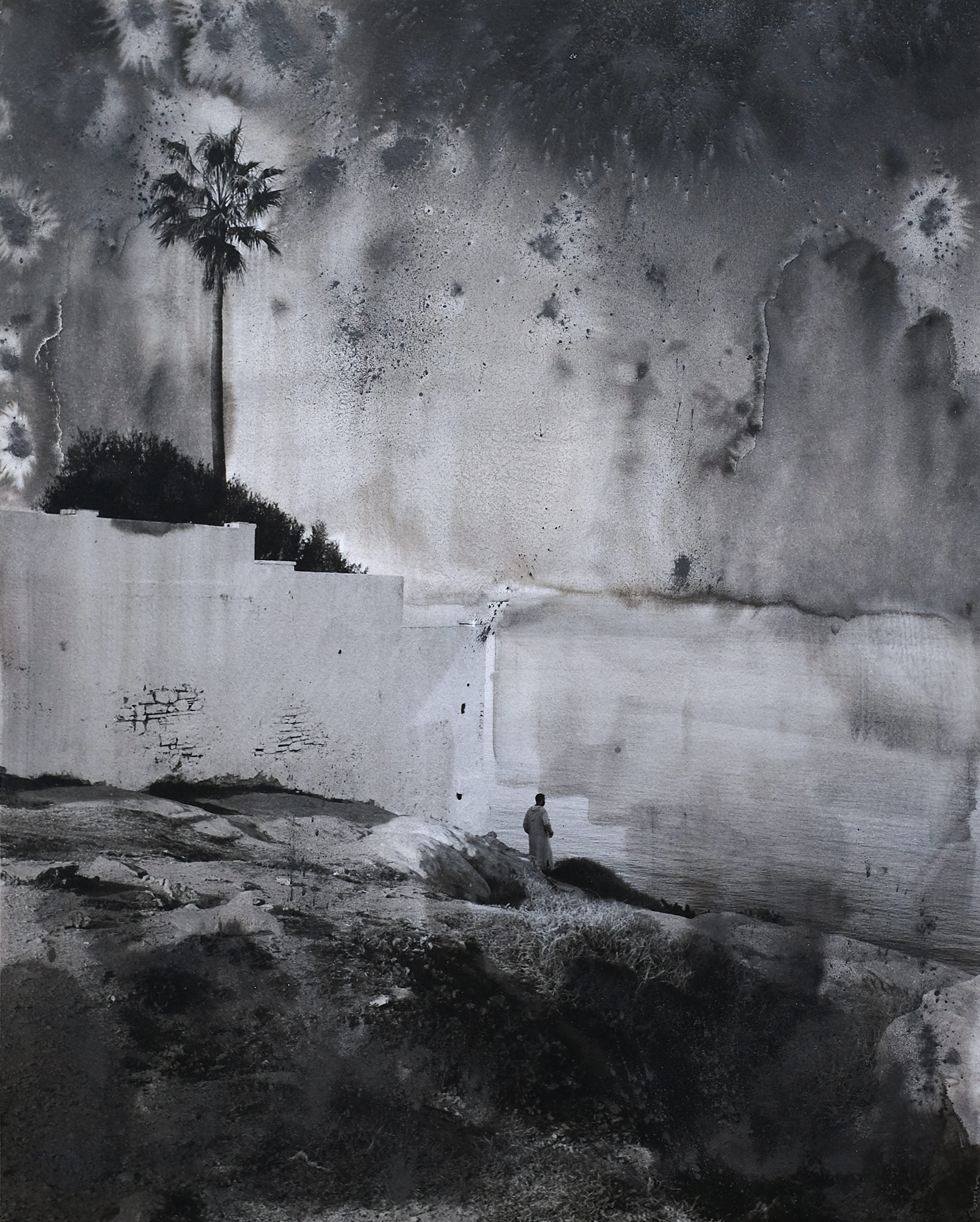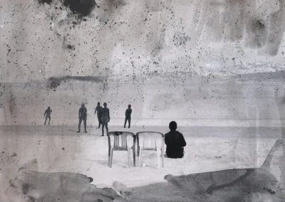 Dans les extraits présentés, la matière photographique est mise au service du sens : cyanotypes, tirages au platine-palladium, surfaces rehaussées d’or, de pigments et de poudres métalliques, sérigraphies sur couvertures de survie. Chaque image cherche un équilibre fragile entre apparition et disparition. En travaillant la matière même de la photographie, le projet révèle la Méditerranée comme un espace d’entropie et de résistance, où le temps se fractionne et se lit par couches.